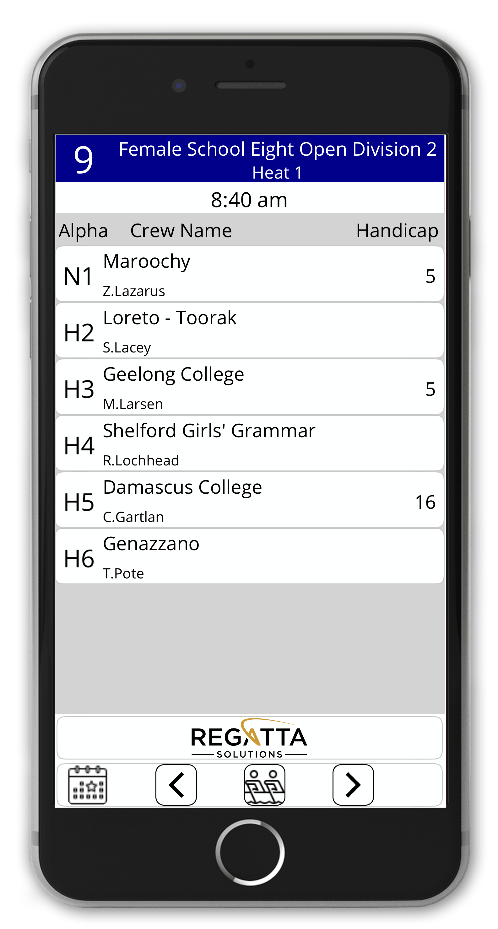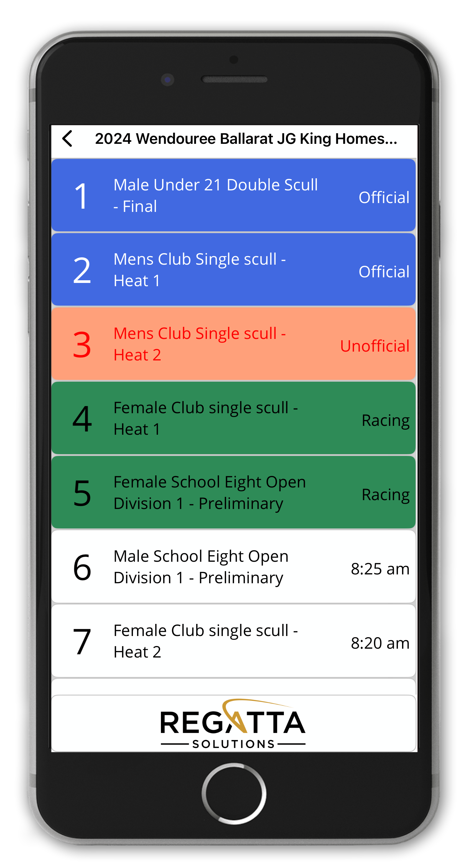 Regatta ScheduleThis is what we refer to as an ‘Active Schedule’. That is we not only show the scheduled time of a race , but highlight which crews have begun marshalling and what races are in progress. If you are standing at the side of the regatta course and want to know what race is going past the app will tell you. With a subscription, you will be able to tag races, crews or even athletes and the app will automatically generate a custom schedule showing you just the races of interest and the current races in progress. It’s even smart enough to let you know if two races are being run out of order. | |
